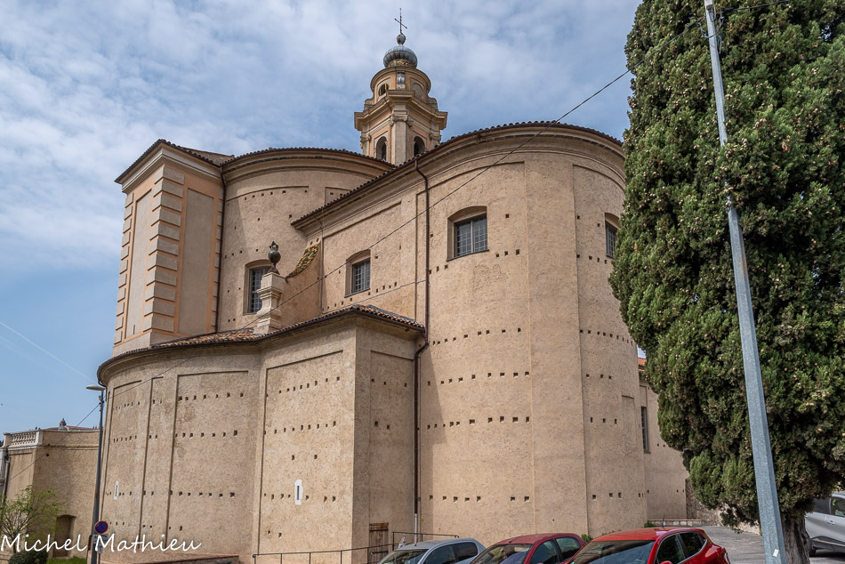 La convexité de la façade est une rareté et fait écho à la concavité de l’Église de Cervo en Ligurie qui date de la même époque. Au-dessus de la porte du couvent, un médaillon couronné porte les lettres O M, Oblats de Marie.