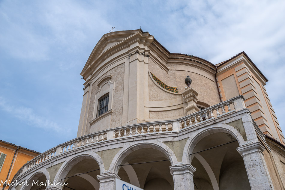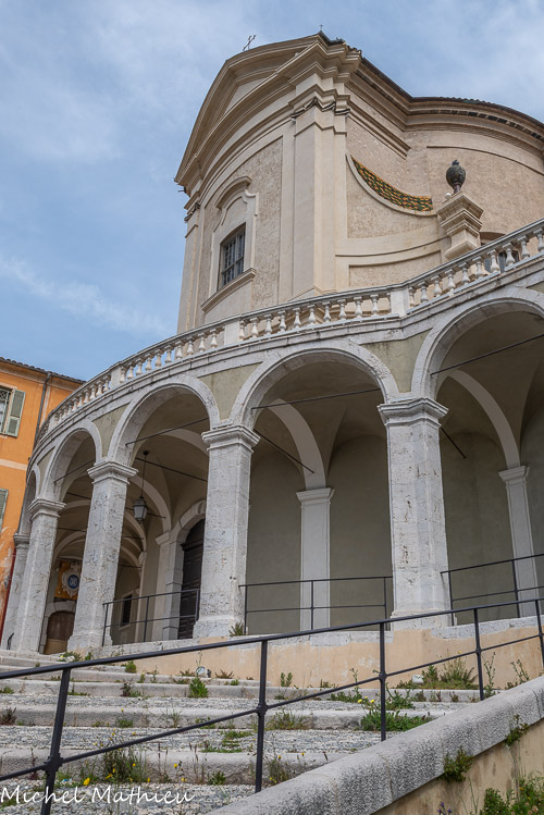 Un portique formant terrasse, supporté par une suite d’arcs en plein cintre, permet la communication avec les bâtiments conventuels et amplifie le développement horizontal du premier niveau. Elle contraste avec l’élan vertical de la façade. Un escalier en fer à cheval composé d’une calade permet d’y accéder. Au bas de l'escalier, sur une stéle est marqué : Ici le 26 septembre 1388, la ville de Nice se donna au comte de Savoie Amédée VII. Cette décision changea son destin et renforça l'identité niçoise. Pour perpétuer cet événement, la ville de Nice posa cette plaque le 28 septembre 2019.