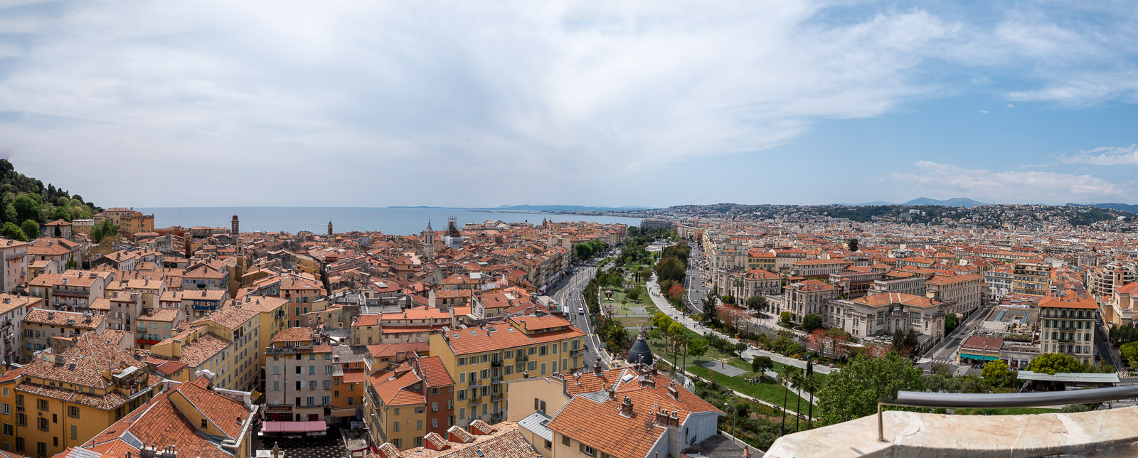 Par ses 50 mètres de hauteur, au nord du Vieux-Nice, le campanile de la Tour Saint-François domine l’ensemble de la vieille ville et offre un panorama à 360° de la mer à l'arrière pays niçois. Clocher de la chapelle sainte Croix, celui de l'église du Gésu, , celui de l'église Saint Giaume, celui de la cathédrale et son dôme, la tour de l'Horloge. Sur la droite, le lycée Masséna.