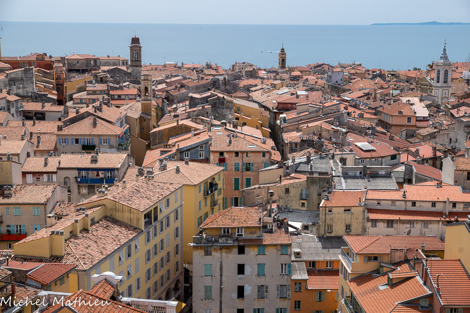 Clocher de la cathédrale avec son dôme, la tour de l'Horloge. A droite le lycée Masséna.