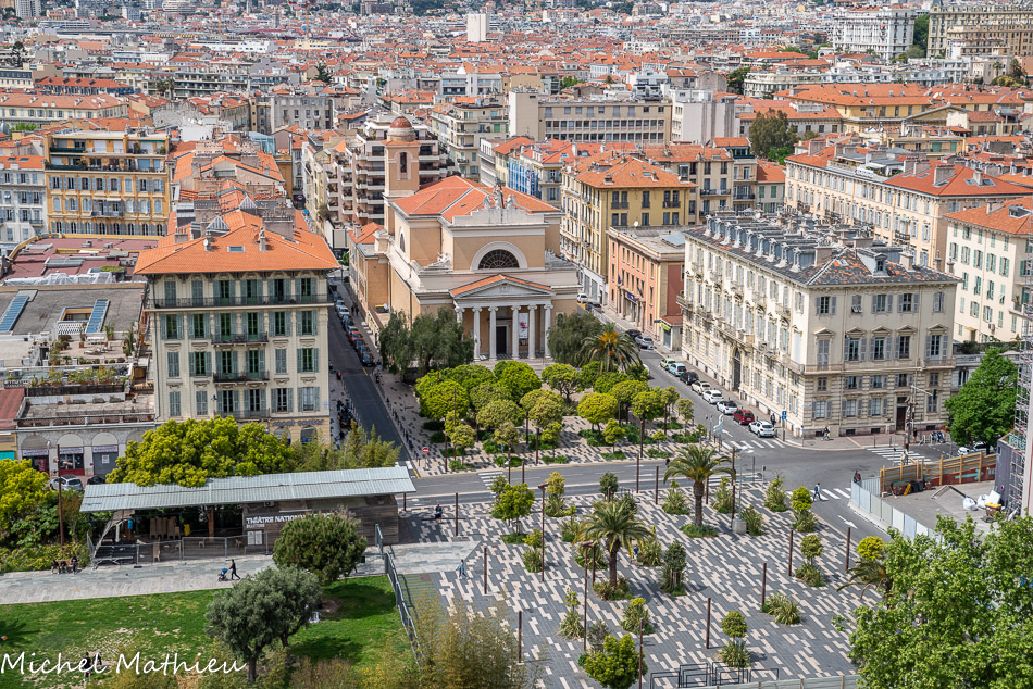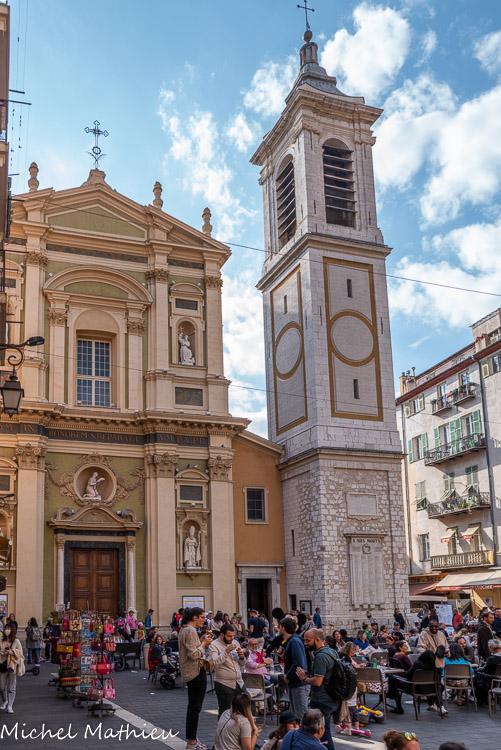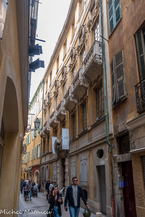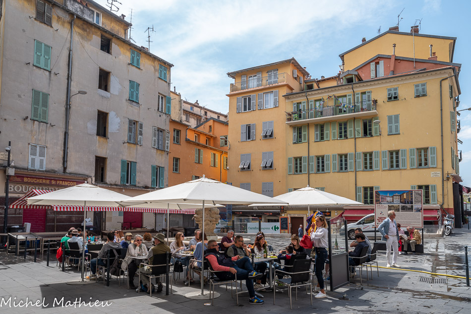 Place Saint-François. En face, salle des Ftranciscains. Édifice patrimonial majeur de l'histoire de Nice, ce couvent des Franciscains a vu le jour au XIIIe siècle et a connu une vie mouvementée. Désacralisé lors de la Révolution, il est devenu tour à tour écurie, appartements, boîte de nuit, cinéma et bâtiment des services municipaux. Ses murs sont bruts, son passé est riche et il retrouve, en avril 2022, toute sa superbe en devenant une des salles du Théâtre National de Nice. Le bâtiment de "L'Aigle d’or" (lors du découpage en 1792, il était devenu un ancien relais de poste) regroupe en son sein les bureaux administratifs du TNN, 2 salles de répétitions (100 m² chacune), un foyer des comédiens ainsi que des appartements mis à disposition des artistes accueillis eu en résidence.