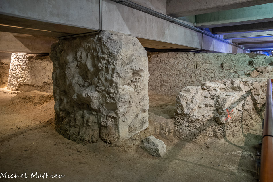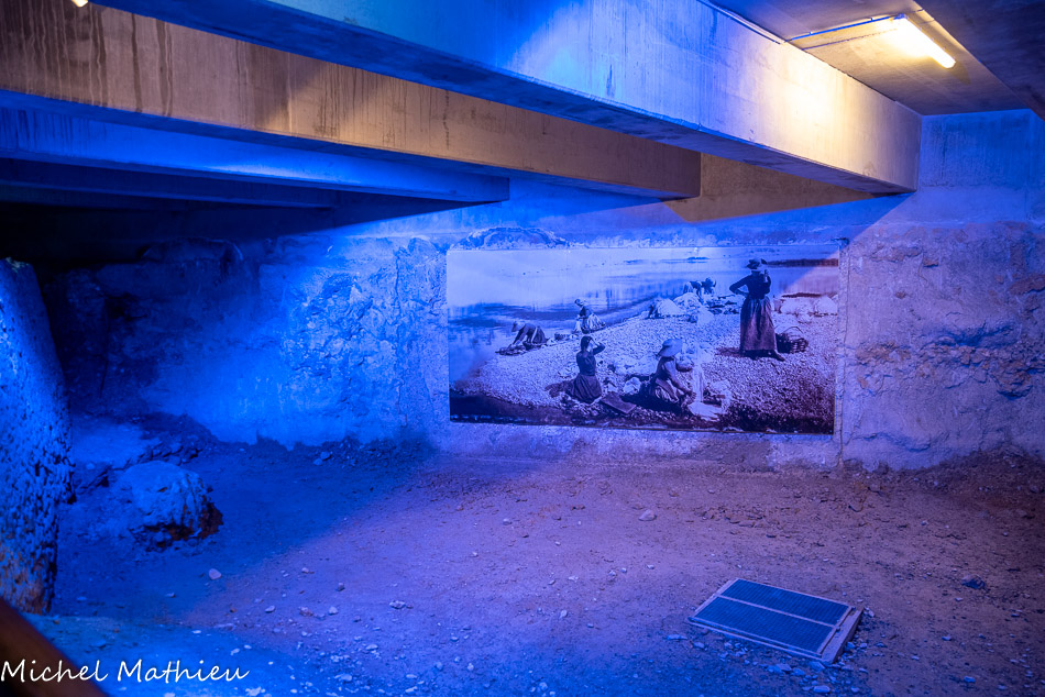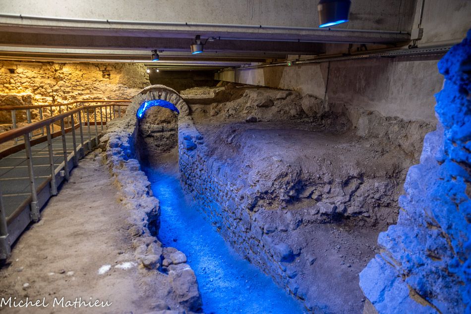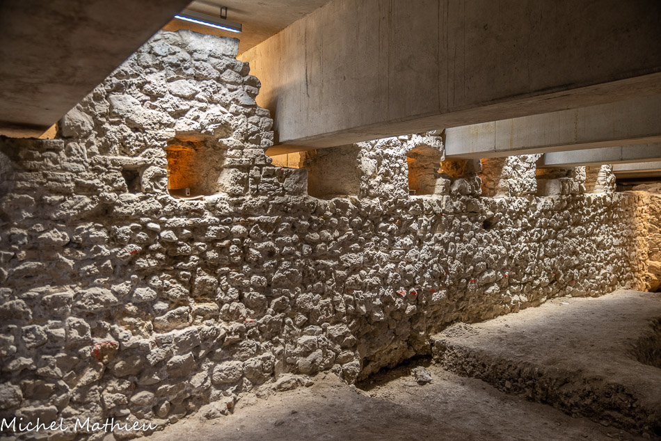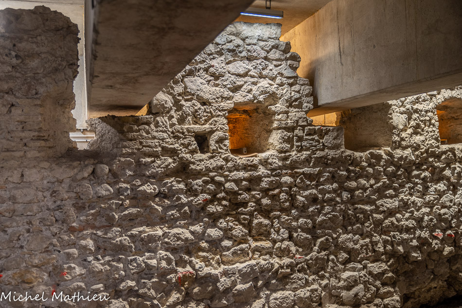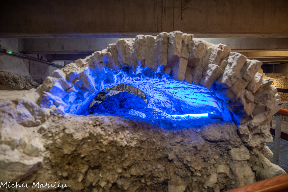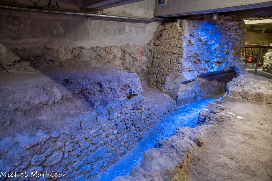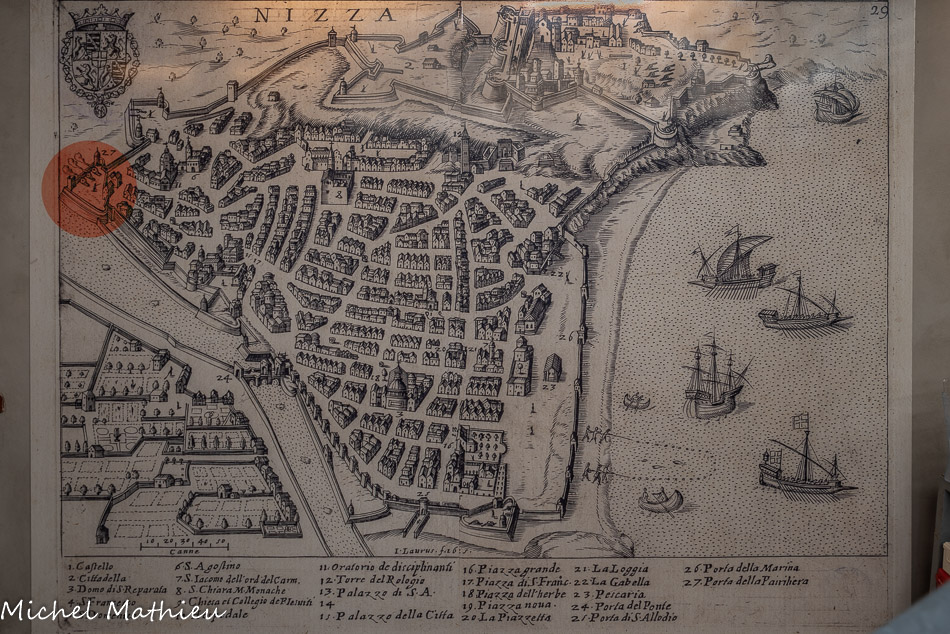 En haut, à droite, le château et la citadelle. A gauche, en rouge, l'endroit où nous sommes, l'ancienne porte de Pairolière. La Crypte est une salle souterraine de 2 000 m² située sous le boulevard Jean-Jaurès et la place Garibaldi, le long du fleuve du Paillon. Ce sont les fouilles archéologiques lors de la construction de la première ligne du tramway de la Métropole Nice Côte d’Azur, en 2006, qui ont permis de dégager des vestiges très bien conservés, autour d’une des entrées principales de la cité, la porte Pairolière, et de mettre en lumière de façon exceptionnelle l’histoire de Nice depuis le Moyen-Âge en tant que place-forte du comté de Provence puis du duché de Savoie.