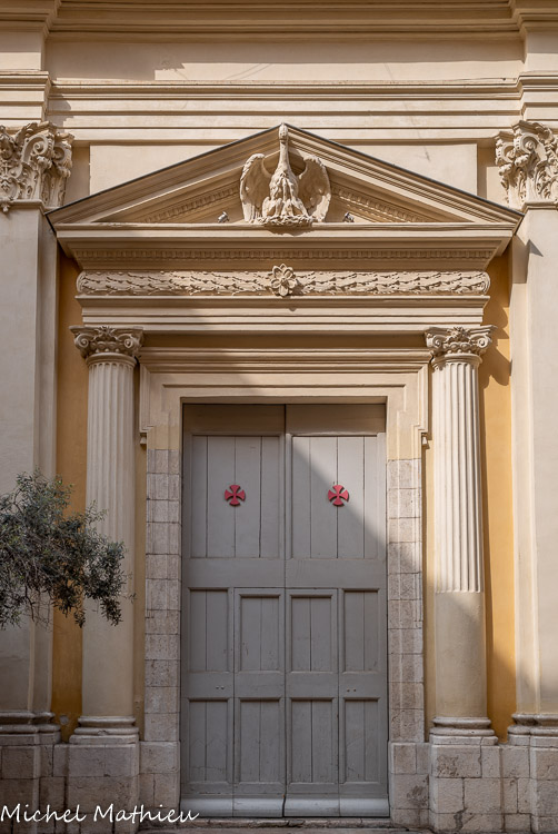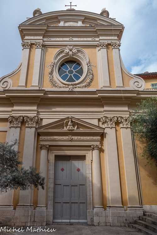 L'Annonciation, 1829. Œuvre du peintre russe K.A. CHEVELKINE, ce magnifique tableau de l'Annonciation a été offert à l'église par le Général niçois Alexandre MICHAUD à la suite de l'incendie du 16 juillet 1834, qui avait détruit le précédent tableau figurant la Transfiguration. Le Général avait lui-même reçu cette Annonciation du Tzar ALEXANDRE 1er en reconnaissance de sa fidélité. Depuis cette date l'Église, dont le titulaire était auparavant Saint Giaume (Saint Jacques), porte le nom de l'Annonciation.