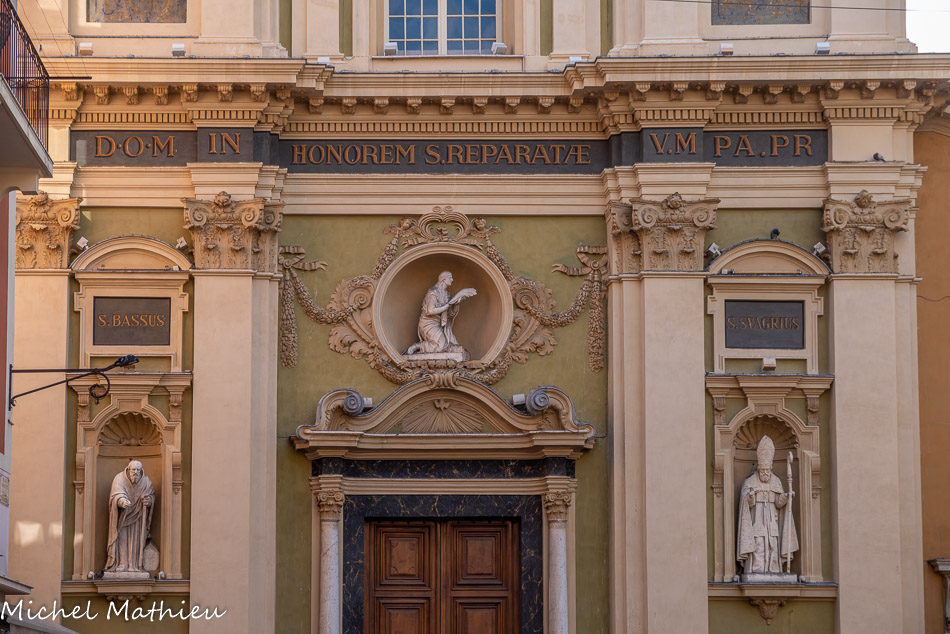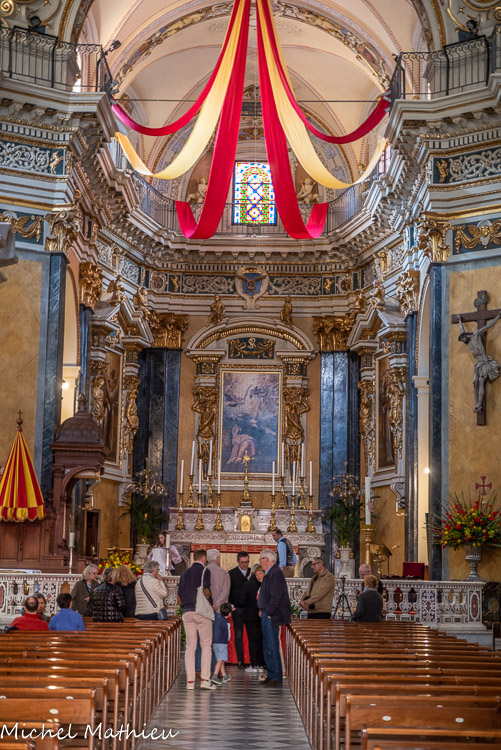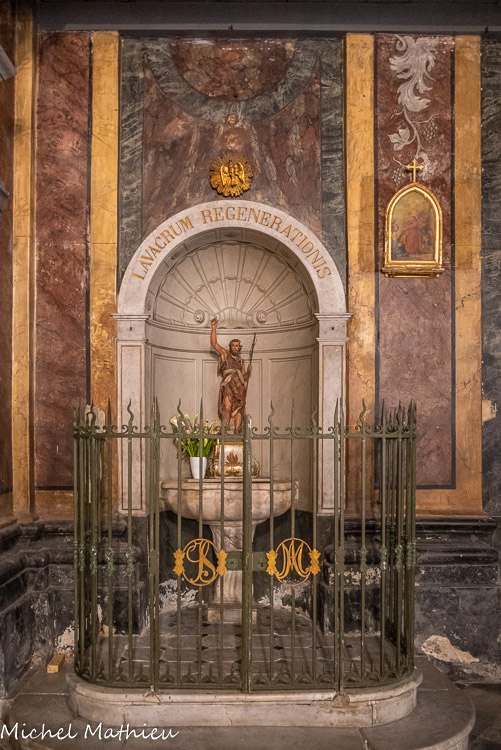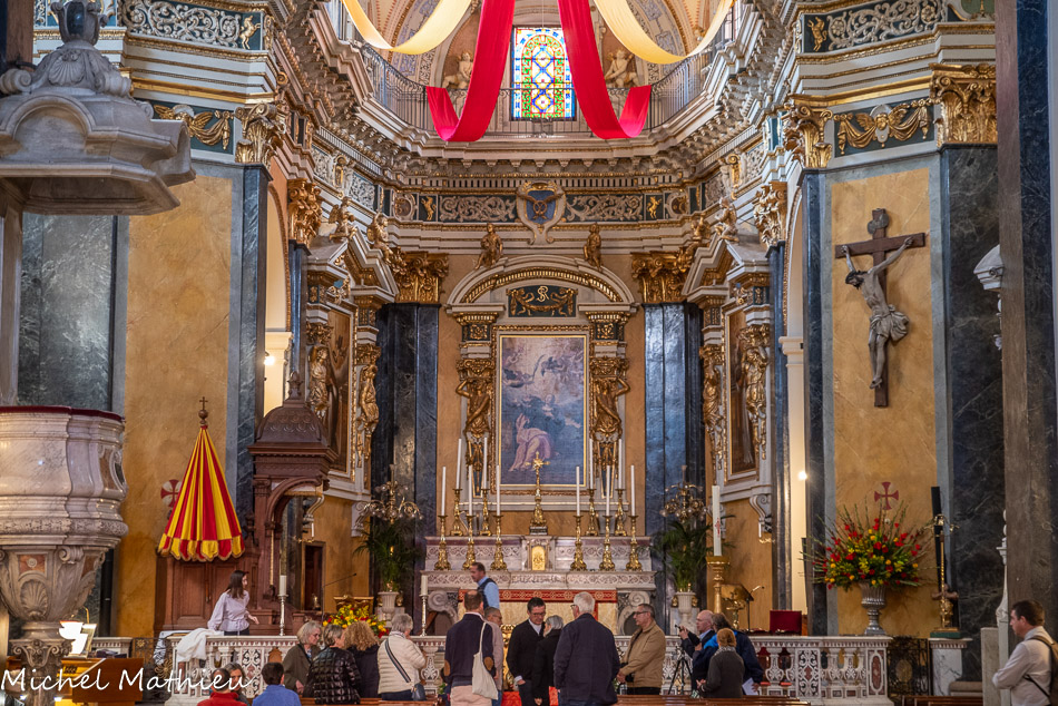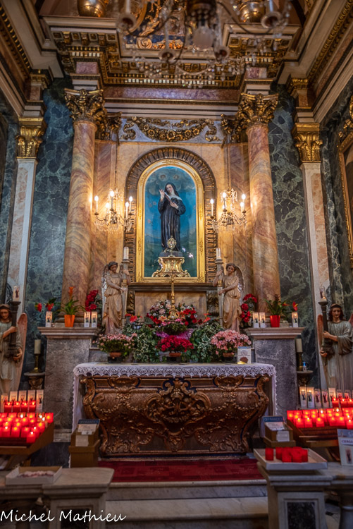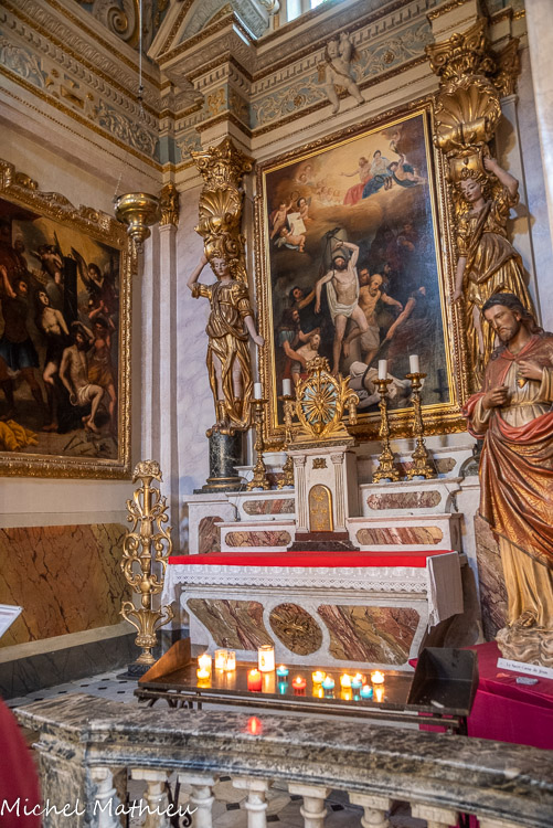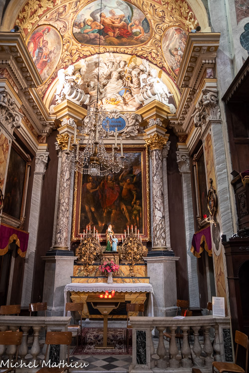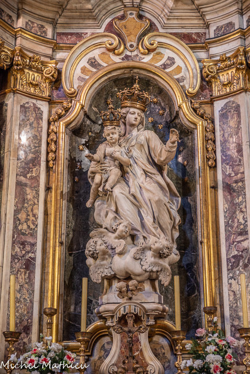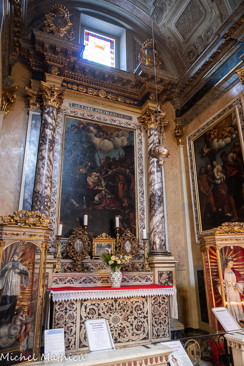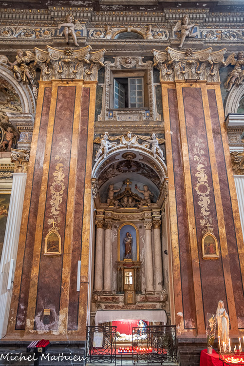 Chapelle Notre-Dame-du-Mont-Carmel. L’ensemble décoratif est dominé par la magnifique statue mouvementée en marbre blanc de la Vierge et l'Enfant, présentant tous deux le scapulaire. Elle est l’œuvre du Génois J.B. Ansaldi (vers 1760-1771). La blancheur diaphane de la statue est rehaussée par les teintes soutenues du fond de la niche. Elle est encadrée par deux colonnes torses de marbres polychromes.