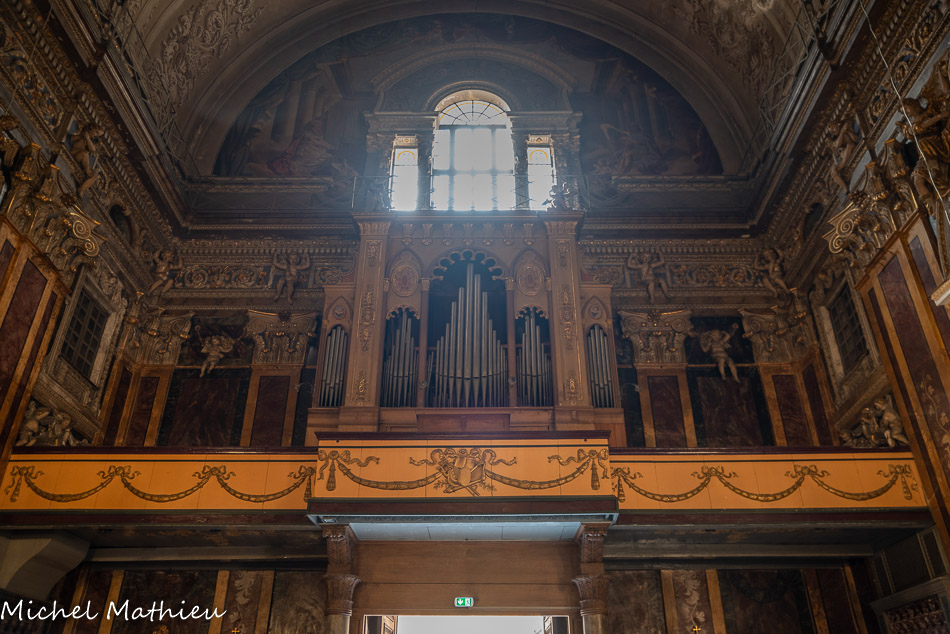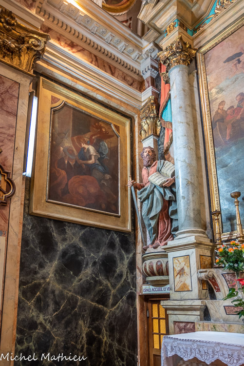Chapelle de Saint-Pierre. Statue de St Paul. Les tableaux des parois latérales (datés de 1699) sont d'Abraham-Louis Van Loo. A gauche, La délivrance de Pierre par un ange.