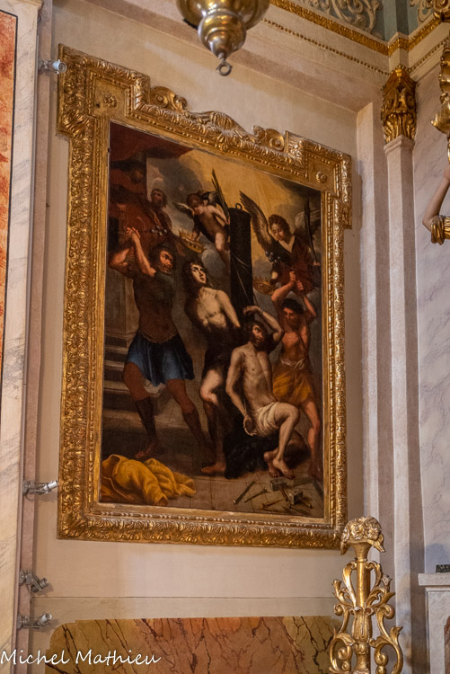 Chapelle des Quatre-saints-couronnés, de la corporation des maçons. Le tableau de droite, peint au XVIIIe siècle, figure saint Séraphin de Montegranaro, maçon devenu capucin, mort en 1604, canonisé en 1767.