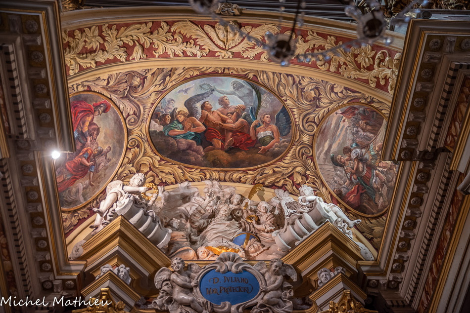 Chapelle de Saint-Julien. Chapelle corporative des tonneliers, XVIIe siècle. Au-dessus du retable, les gypseries qui composent des nuées portant un Père Éternel et des angelots constituent l’un des meilleurs exemples du travail du stuc dans les églises niçoises.