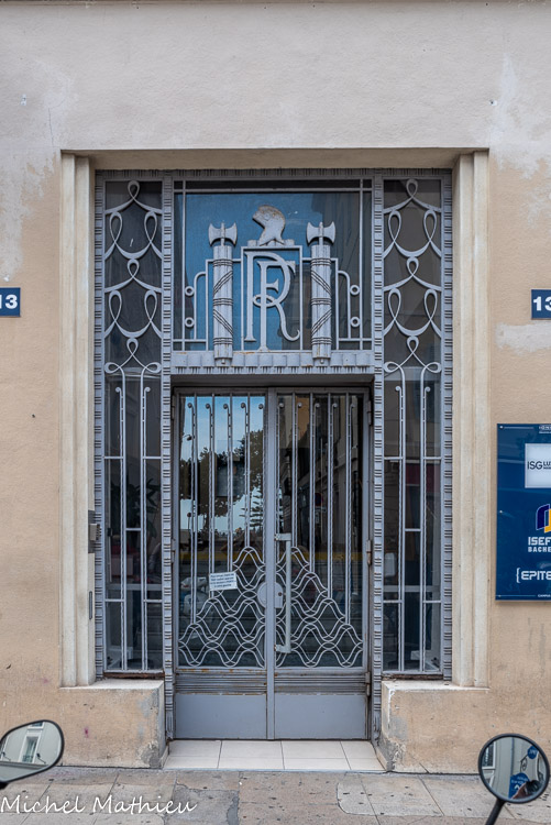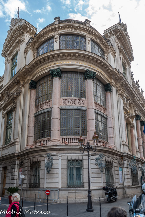 L’opéra de Nice. La rotonde d'angle avec ses verrières. Sur les murs, grandes lanternes extérieures en bronze richement ornée, suspendues à un bras d’applique en crosse (accolées à un support ornementé d’une lyre. Le luminaire est aujourd’hui électrifié, vitrée sur ses 4 faces).