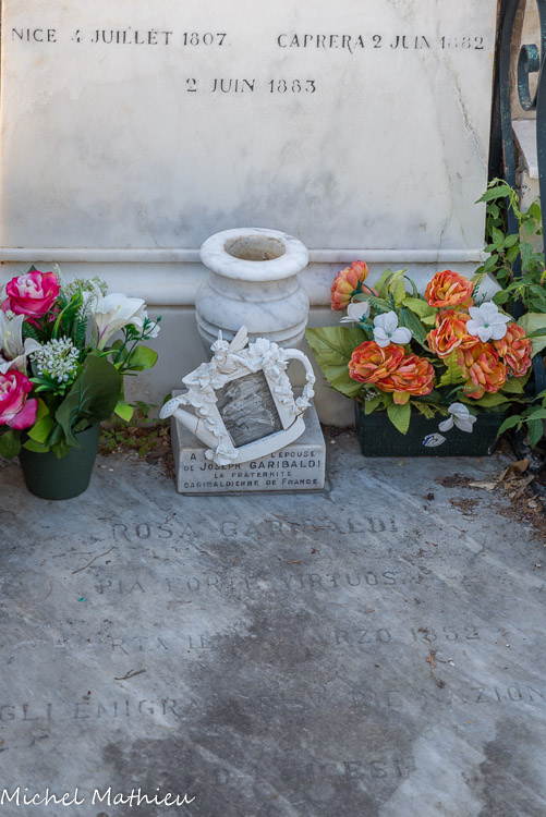 Vue de la tombe de la mère de Giuseppe Garibaldi, Rosa. Certains pensent à tort que Garibaldi repose ici : il se trouve en réalité sur l’île de Caprera, en Sardaigne, dans un sépulcre fermé par une importante pierre de grès blanc.