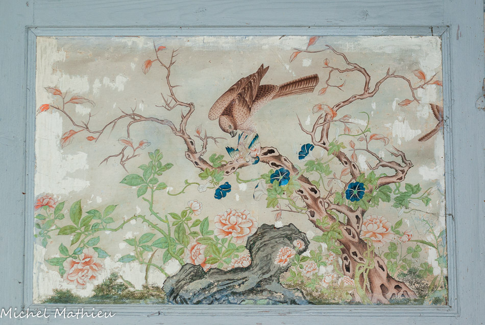 La salle à manger. Les deux pièces du rez-de-chaussée, salle à manger et salon de musique, sont décorées de peintures en trompe-l'œil à la mode italienne.