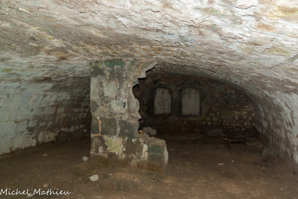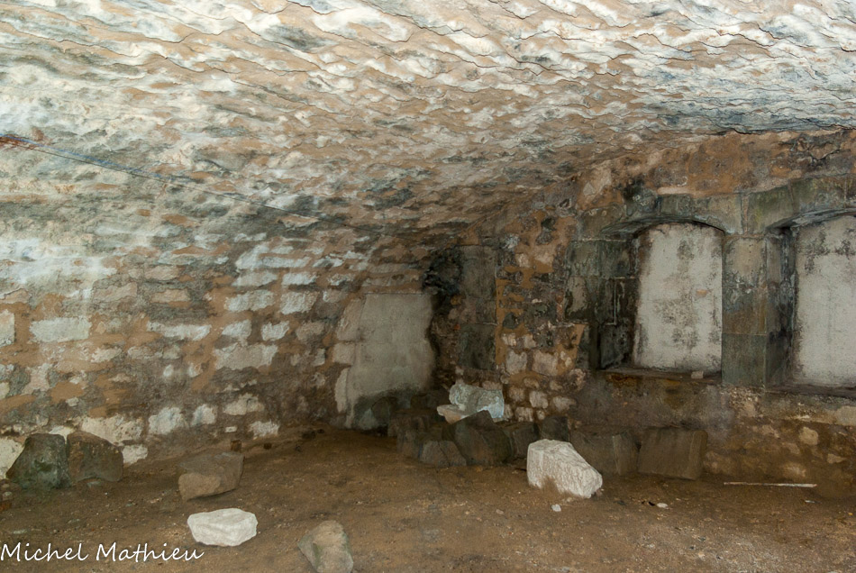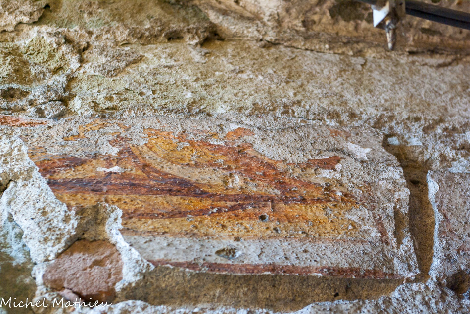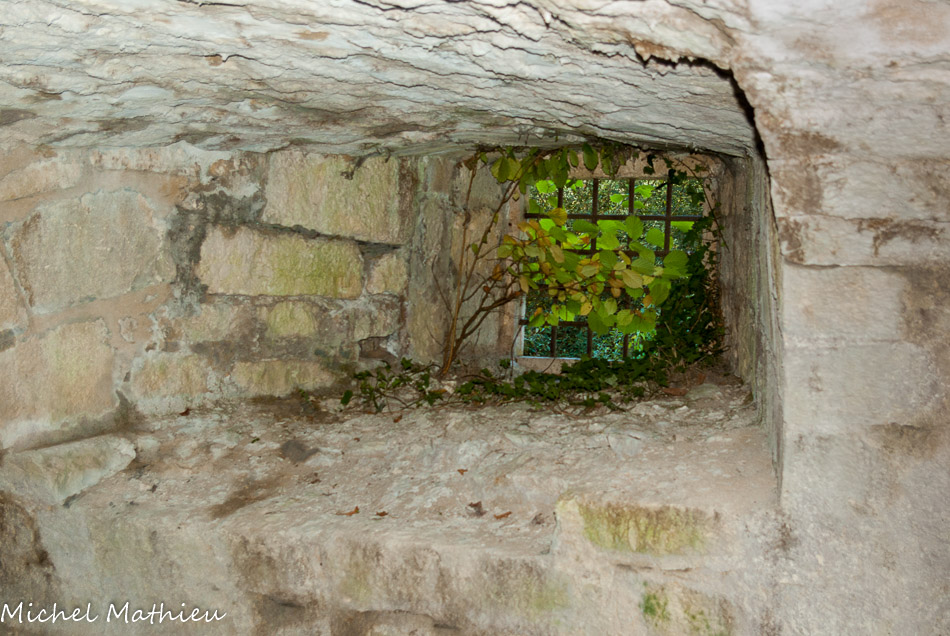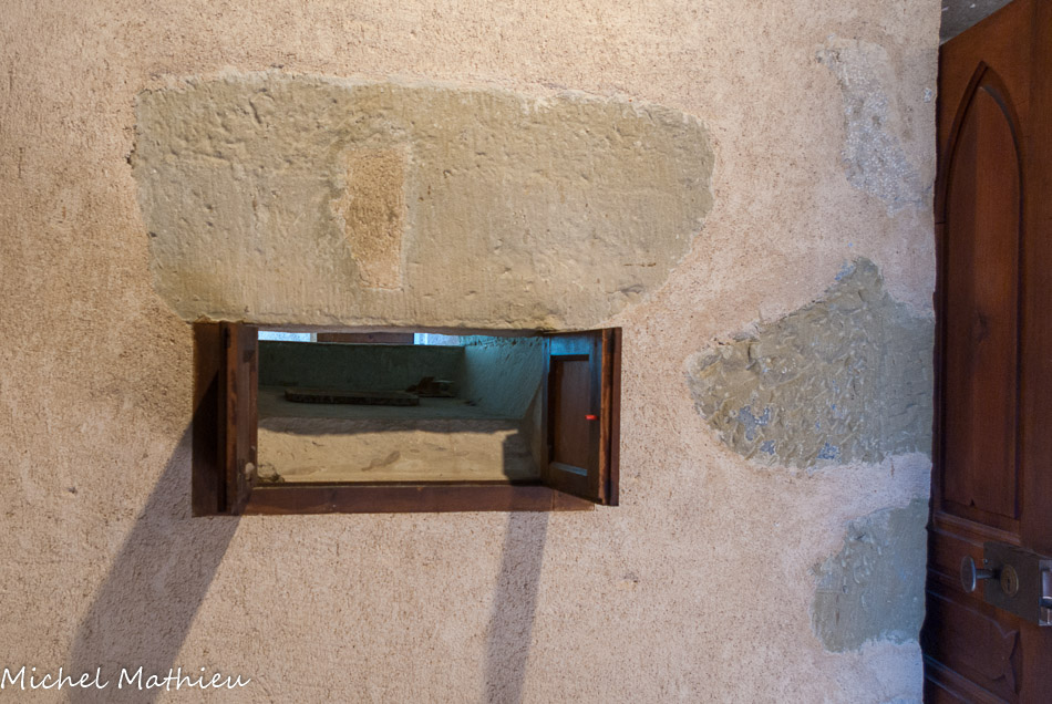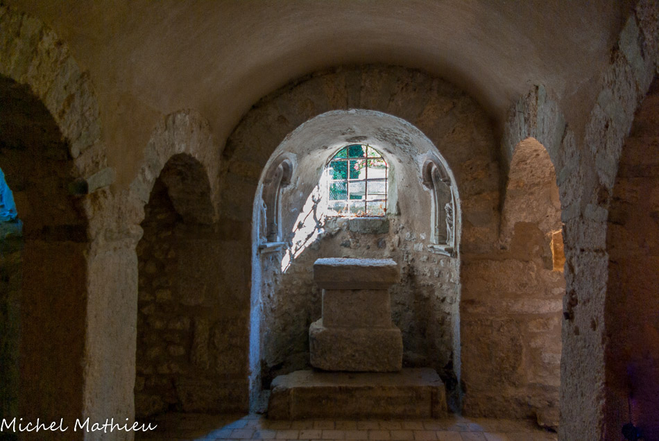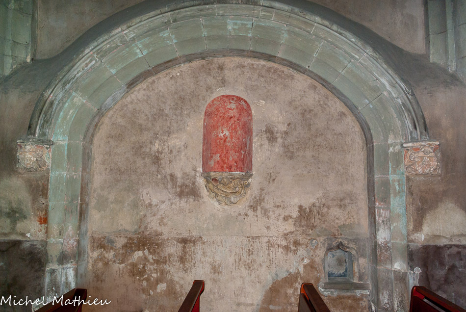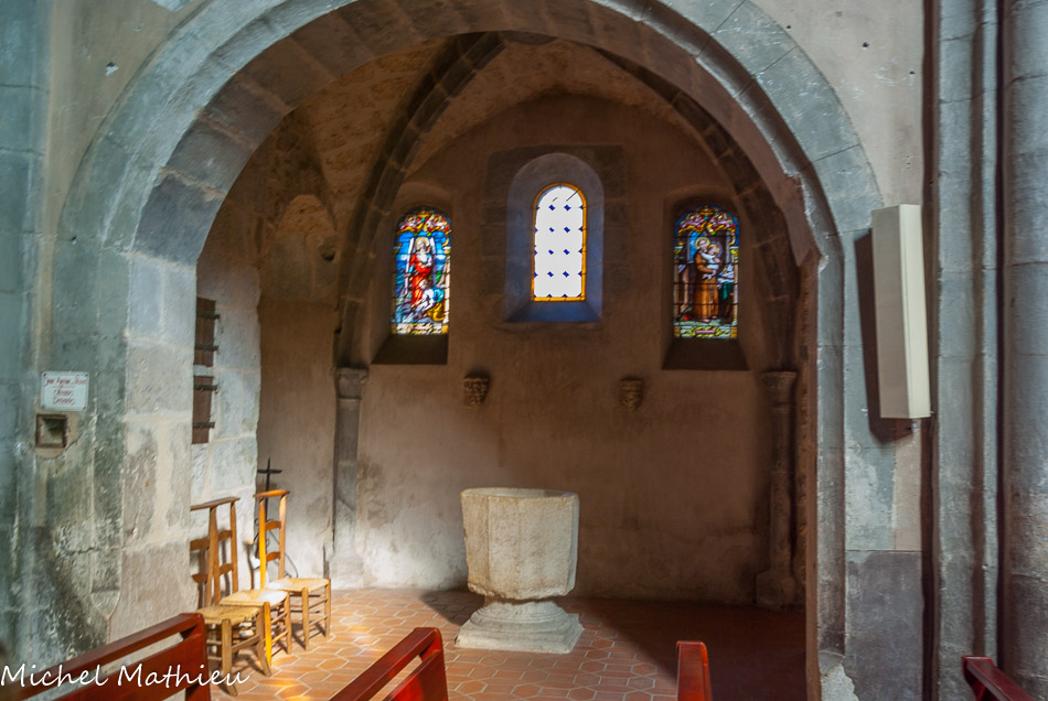La chapelle des fonts baptismaux0. Les chapelles latérales ont conservé leur arcature en plein cintre et leurs fenêtres romanes. A gauche en entrant, on remarque un bénitier rectangulaire du XIIIe siècle.