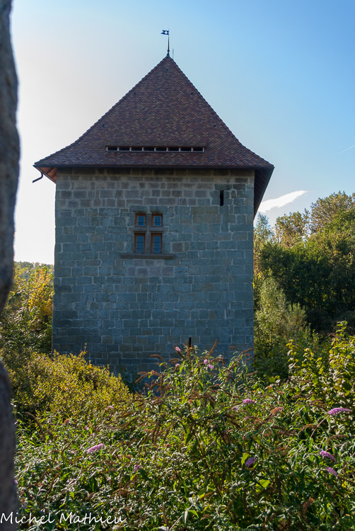 a tour nord-ouest (le donjon) est la plus importante. Elle comportait quatre étages et mesurait 18 mètres de haut et 10 mètres de côté. Les planchers des différents étages ont disparu mais on peut encore voir les cheminées en molasse et les latrines à chaque étage. Les fenêtres à coussièges étaient fermées par du verre, signe de modernité et de confort. Un escalier à vis dessert les différents étages.