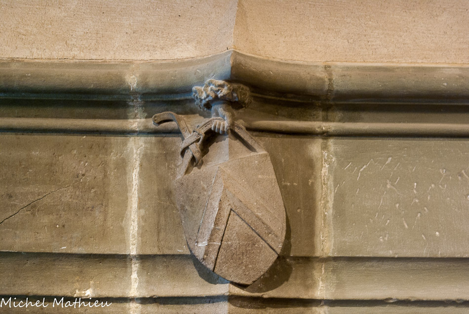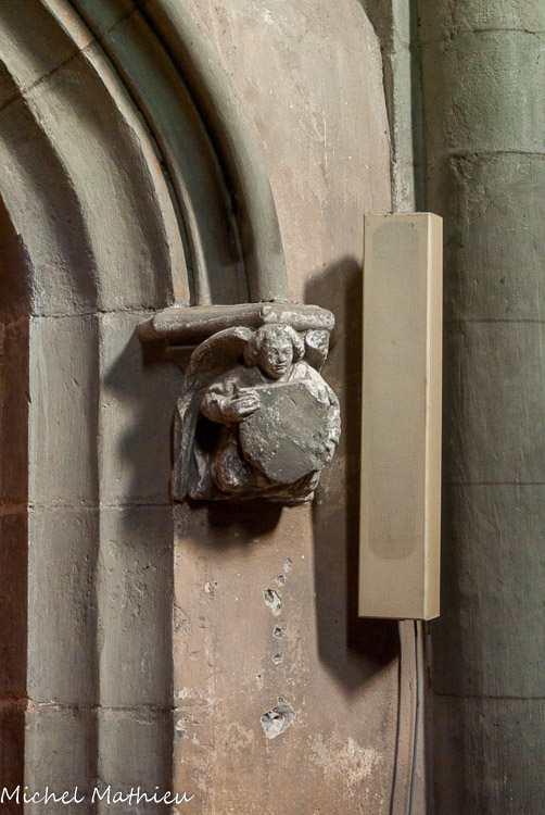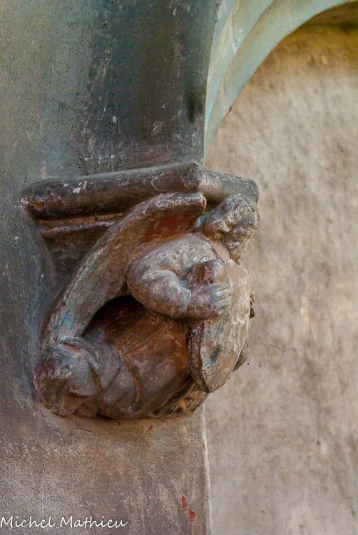 Modillon sculpté en demi-relief représentan un ange en buste tenant l'écu des Luyrieux. 4e quart 15e siècle
