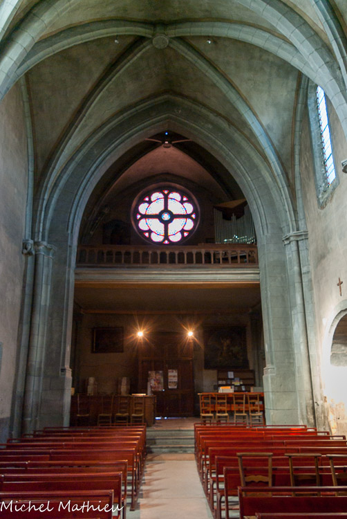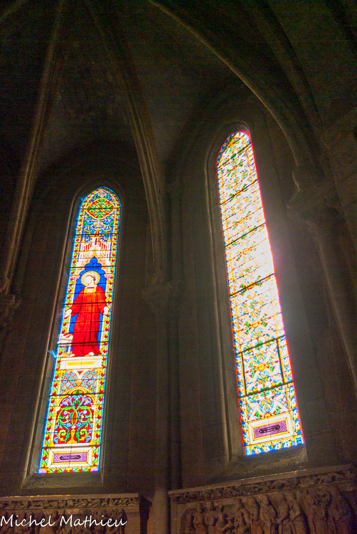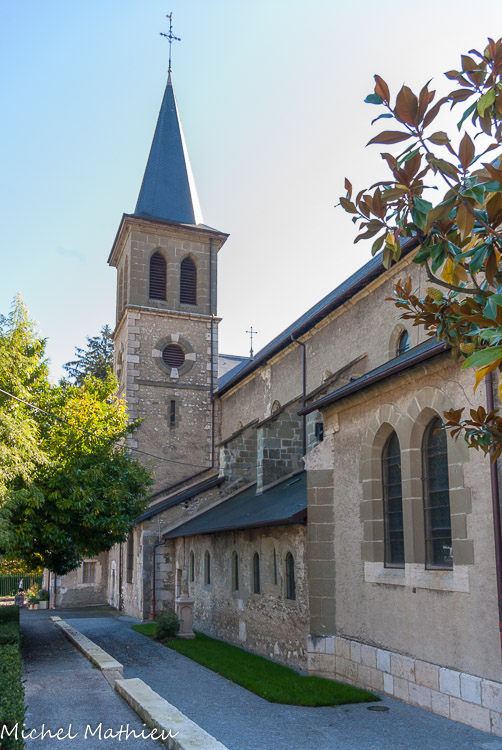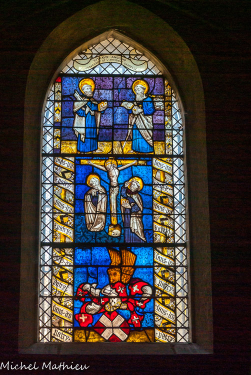 Dans la chapelle de la Sainte Vierge, on peut observer le vitrail du XIVe siècle. La partie supérieure n'appartenait peut-être pas au même vitrail car elle est plus large que les registres inférieurs et le fond est de couleur différente. En haut, Pierre et Paul sur fond violet damassé. Au-dessous, la crucifixion avec Marie et Jean. Le dernier registre porte les armes des princes de Savoie. La bordure qui entoure le vitral est du XVe siècle, comme l'attestent les armes et la devise des De Luyrieux.