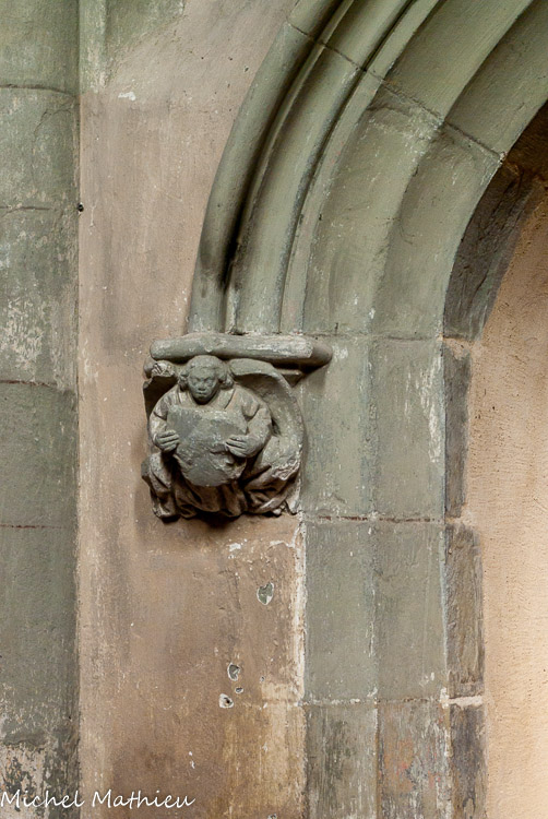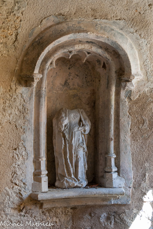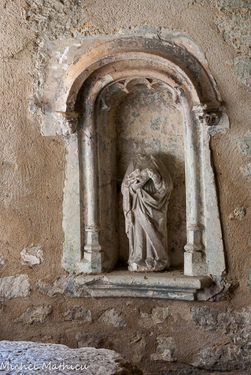 A gauche en entrant, on remarque un bénitier rectangulaire du XIIIe siècle ( en bas, à droite). Au centre de l’arc ogival trônait une très belle statue représentant une Vierge enseignante, statue en pierre polychrome du XVème siècle. (Statue non visible de nos jours.)