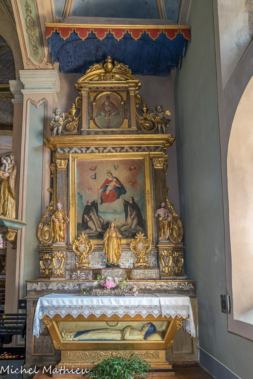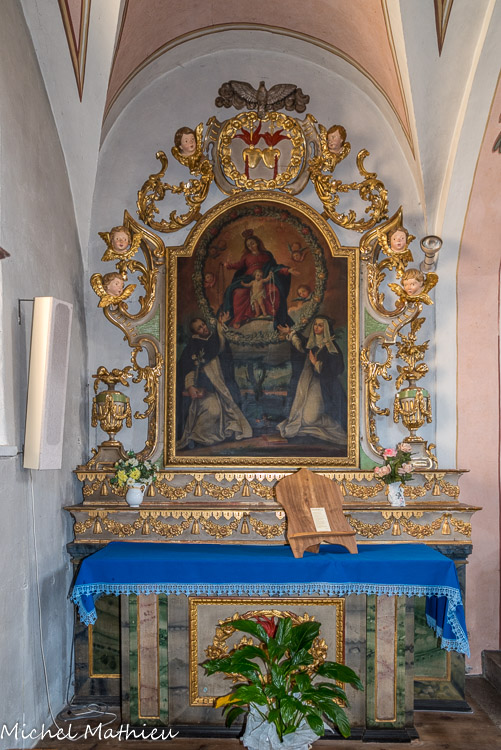 Autel du Rosaire. Toile peinte et cadre datés de la première moitié du XVIIe siècle. Encadrement précieux posé sur deux gradins à frise fleurie. Au sommet : les deux cœurs flambants de Marie (le glaive) et de Jésus (la croix) figurent dans un gros médaillon couronné par la colombe du Saint-Esprit.