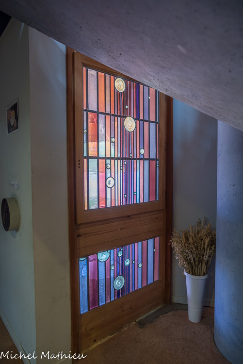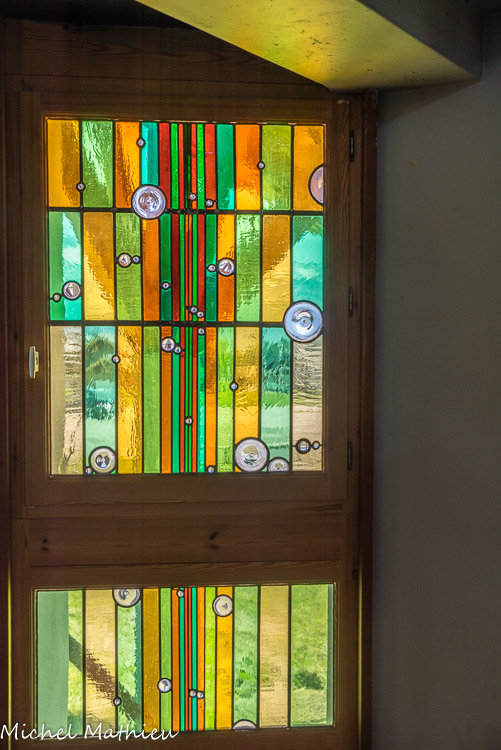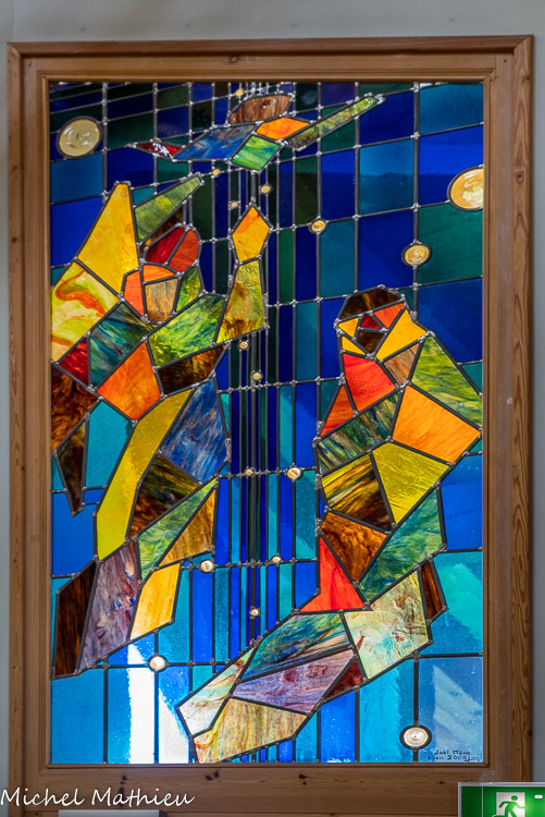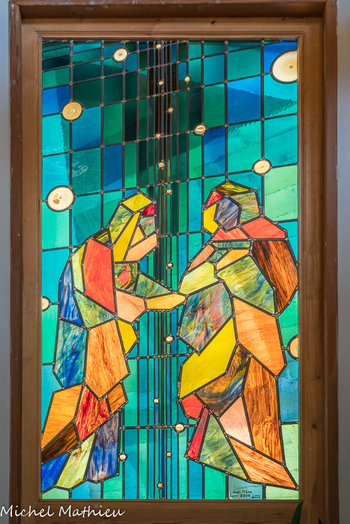 Les vitraux sont l’œuvre de Joel Mône verrier à Lyon avec une visitation et une annonciation de chaque côté du chœur et une nativité (2008). 4 piliers.
