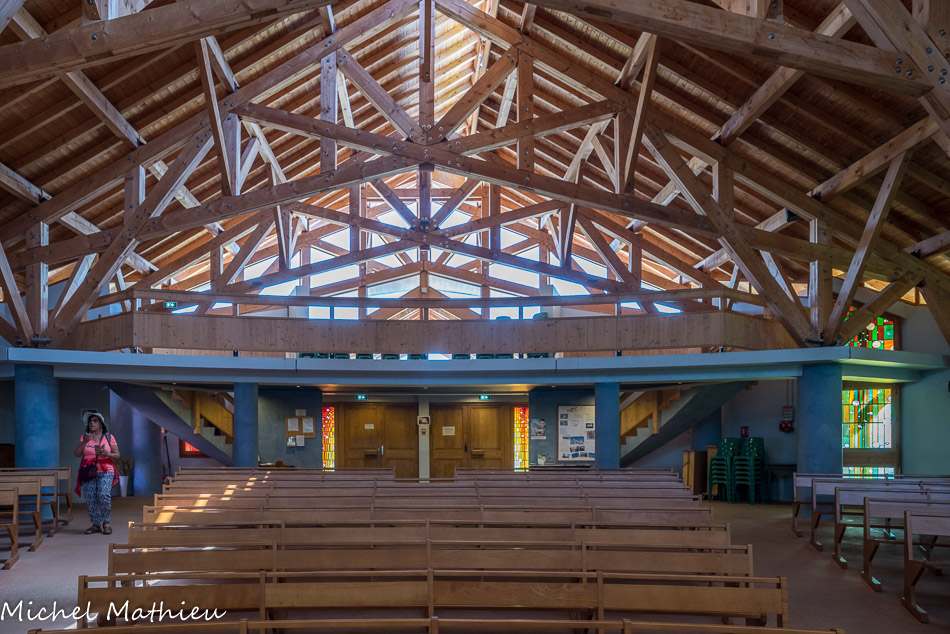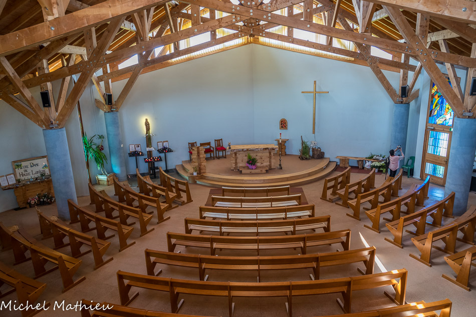 La salle comme un théâtre descend vers l’autel. Le nom Notre Dame de Haute Lumière vient de son architecture avec de nombreuses ouvertures orientées plein sud apportant beaucoup de lumière à l’intérieur de l’édifice. La charpente, impressionnante, repose sur sept fermes (symbole des sept dons de l’Esprit Saint) fixées sur les colonnes, elles-mêmes ancrées sur le rocher.