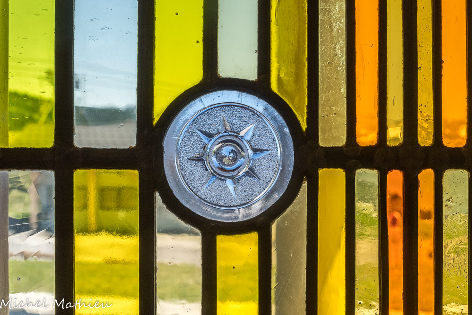 Attique : la colombe du Saint-Esprit figure dans un vitrail du XIXe siècle, inséré dans un œil-de-bœuf.