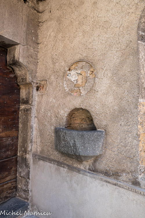 Sculptée par Jacques Clérant (originaire de Moûtiers), en noyer enduit d’une patine noire. Cuve hexagonale, ornée des quatre Pères de l’Église latine en haut-relief : : le pape Grégoire le Grand, saint Augustin évêque,