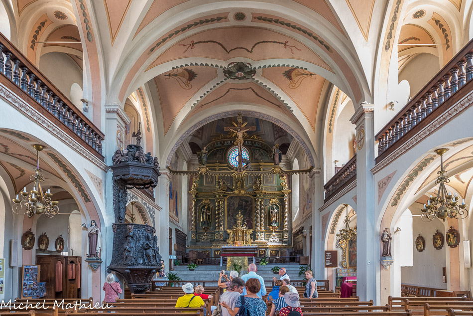 L'église comporte une nef centrale et deux collatéraux. La tribune à retours d’angle avec une balustrade en noyer va jusqu’au chœur. Le chevet est plat.