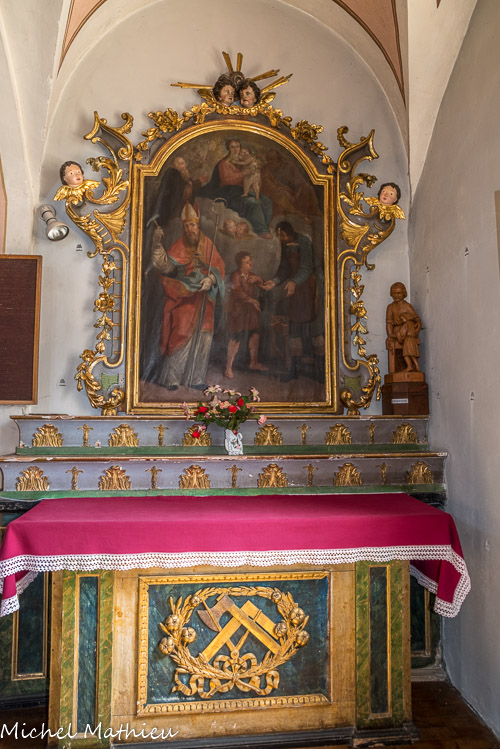 Autel saint Éloi. Retable de corporation de métier, dédié à saint Éloi. Une hache, une équerre et un compas décorent le devant d’autel.