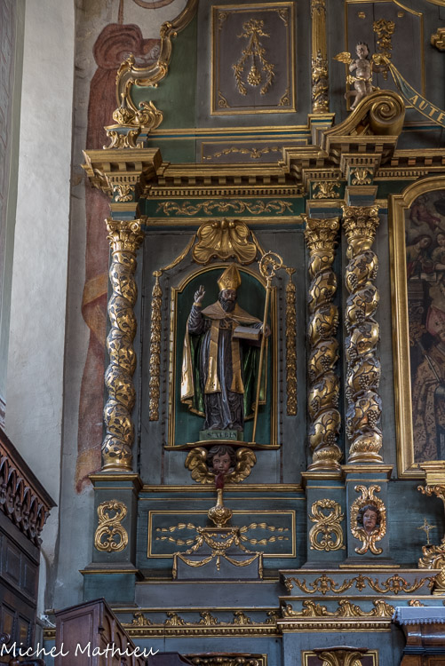 Registre inférieur. Niche droite : statue de saint Guérin portant la clé de son cilice (protecteur des troupeaux de bovins) attribuée à François Cuenot.