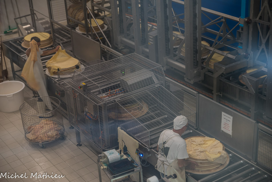 À la sortie des presses, les fromages sont marqués d'une lettre indiquant l'instant de fabrication (matin ou soir), de la lettre du fromager, de la lettre de la cuve, du jour et du mois de fabrication. Ces meules sont en train d'être retournées par un robot : la première colonne a été retournée. L'homme est plus rapide que la machine : il peut faire 70 retournements dans l'heure.