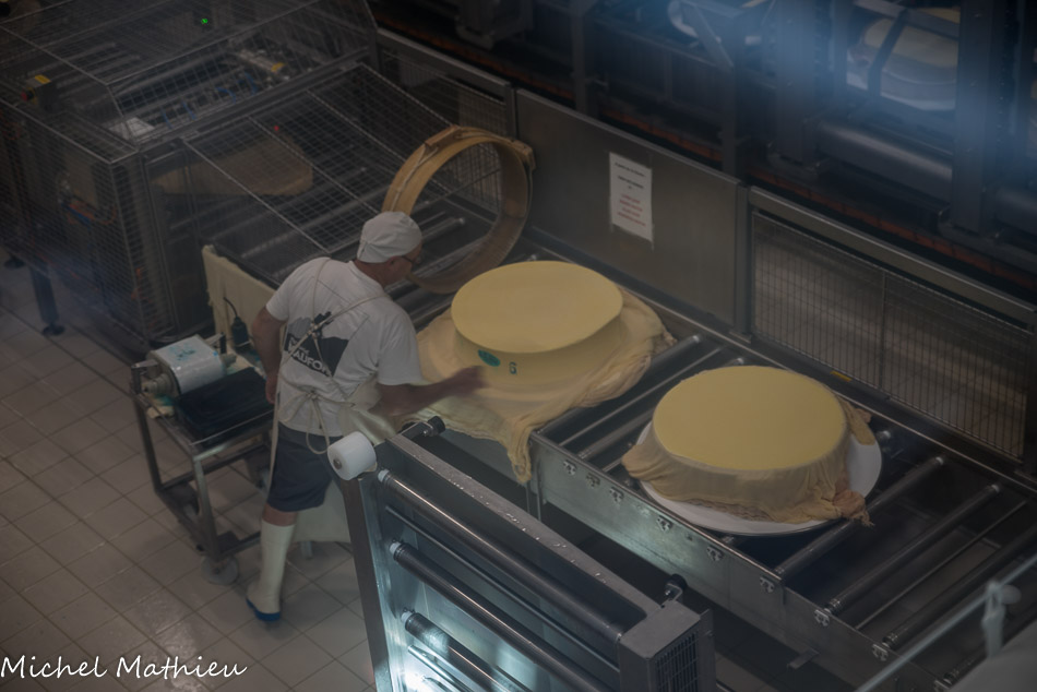 Pressage et retournement. Les fromages sont mis en presse, soumis à une force proche de 1000 kg, jusqu'au lendemain. Les grains se soudent et le petit-lait s'écoule. Plusieurs retournements seront réalisés afin de changer la toile et de resserrer le cercle.
