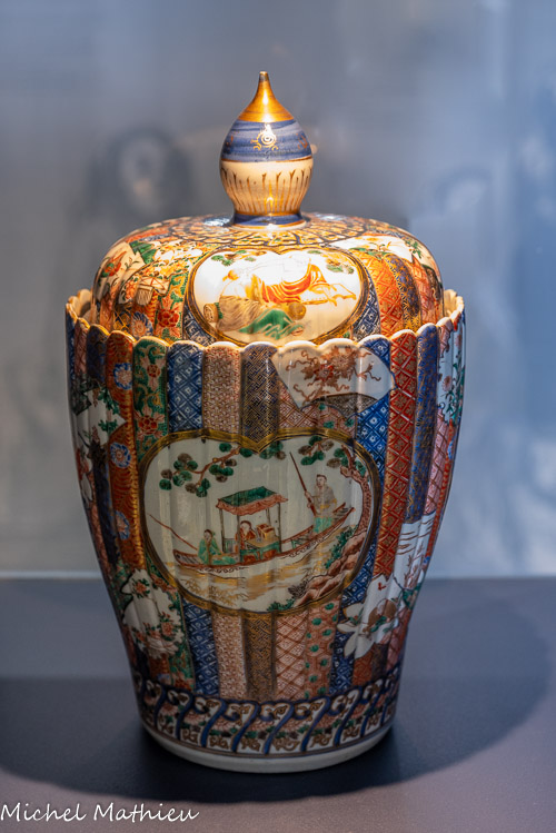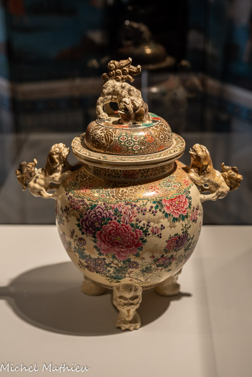 Des lions fabuleux (shishi) forment les anses du vase, surmonté du même animal, braqué et modelé en ronde-bosse (hineri).