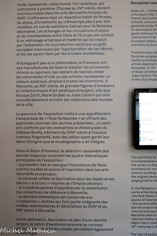Le parcours de l’exposition invite à une appréhension transversale de « l’Asie fantasmée » en offrant des approches diverses des œuvres présentées ; un parti- pris conforté par les contraintes architecturales du château Borély, bâtiment du XVIIIe siècle à l’espace intérieur fr