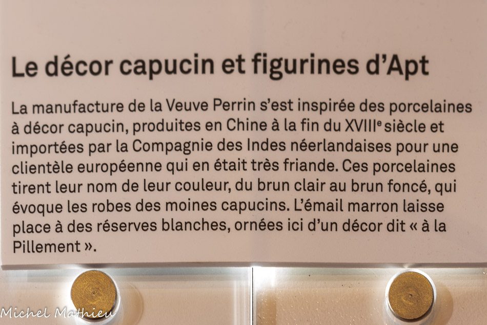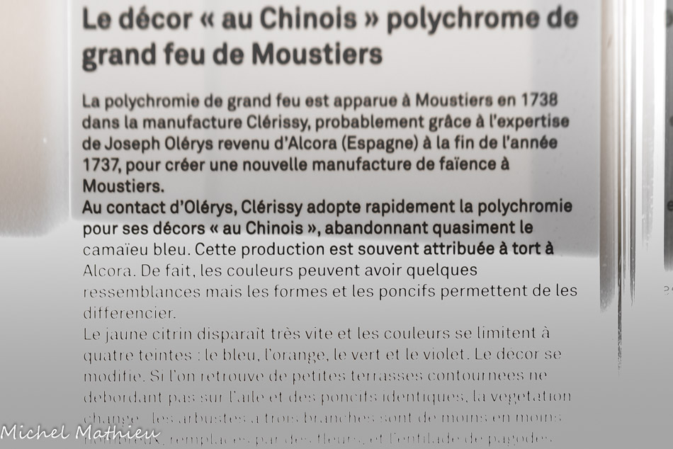 C’est seulement au milieu des années 1730 que, tenant compte d’un regain d’intérêt pour les chinoiseries, Pierre II Clérlssy, devenu le directeur de la manufacture familiale de Moustiers en 1736, utilisa les figures de Chinois pour diversifier ses décors. Rebord en camaïeu bleu, elles devinrent polychromes pour disparaître au début des années 1740, remplacées par les grotesques d’Olérys, décor où l’exotisme n’est pas totalement absent. Elles réapparurent dans la seconde partie du siècle, surtout avec l’avènement du petit feu.