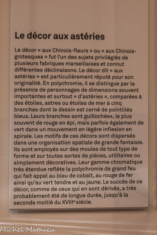 C’est vers 1730 qu’apparaissent à Marseille les premières pièces à décor de Chinois en camaïeu de bleu de grand feu sur fond blanc ou parfois légèrement bleuté. Ces décors, souvent exubérants, sont dénommés aux Chinois-fleurs ou aux Chinois-grotesques.