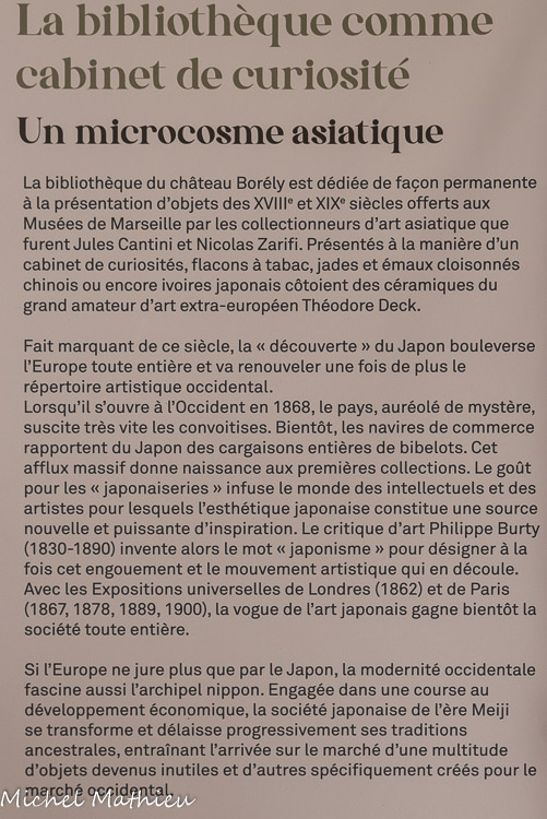 Par sa situation privilégiée sur la Méditerranée et depuis l’Antiquité, Marseille s’inscrit pleinement dans l’histoire des échanges avec cette Asie plurielle, renouvelés par l’avènement des empires coloniaux au cours du XIXe siècle. Le château Borély, reflet des ambitions de l’une de ses plus entreprenantes dynasties de négociants, s’est naturellement imposé pour servir d’écrin à cette présentation. Après deux siècles d’accroissement, les musées de la Ville de Marseille sont riches d’œuvres qui témoignent de cette histoire partagée avec le Proche et l’Extrême-Orient. Complétée d’importantes, et parfois inédites, collections publiques et privées provençales, l’exposition où se croisent arts décoratifs, arts graphiques, faïence et textile, se propose de refléter toute la richesse et la diversité de cette « Asie fantasmée ».
