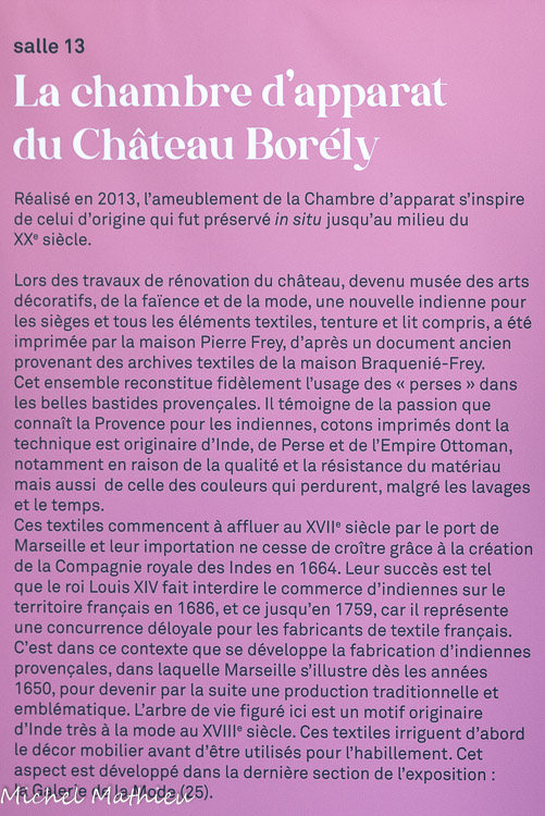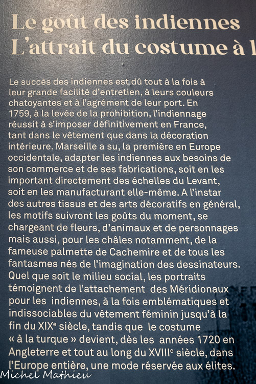 - la dernière thématique est consacrée aux « indiennes », textiles qui font partie intégrante des modes vestimentaires et décoratives du XVIIIe et du XIXe siècle à Marseille.