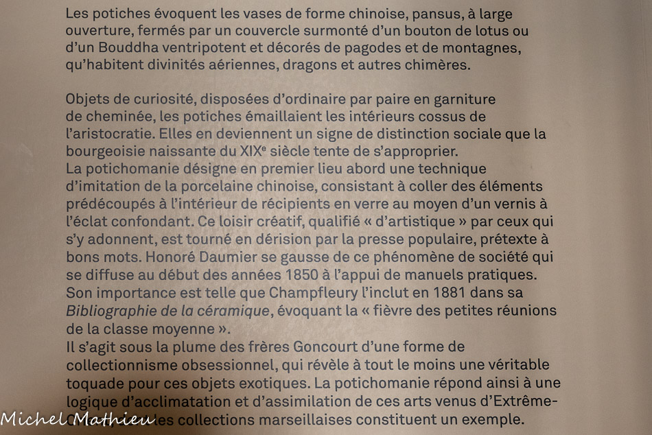 N’échappant pas à ce phénomène, la Provence voit ses manufactures de faïence adopter les ornements chinois ou japonais, ses ateliers de textiles imiter les cotonnades d’Inde ou ses artistes représenter un ailleurs asiatique, propice à toutes les inventions. A Marseille, au XIXe siècle, de grandes figures d’amateurs et collectionneurs d’art asiatique émergent, tels que Nicolas Zarifi, Marie Grobet ou Jules Cantini qui vont considérablement enrichir les collections des musées de la ville.