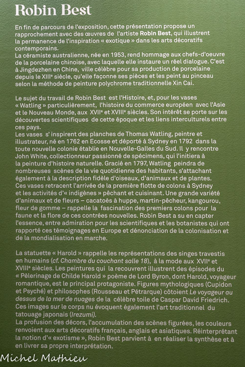 La profusion des décors, l’accumulation des scènes figurées, les couleurs renvoient aux arts décoratifs français, anglais et asiatiques. Réinterprétant la notion d’« exotisme », Robin Best parvient à en réaliser la synthèse et à en livrer sa propre interprétation.