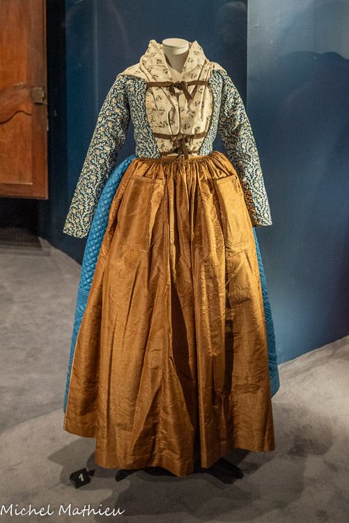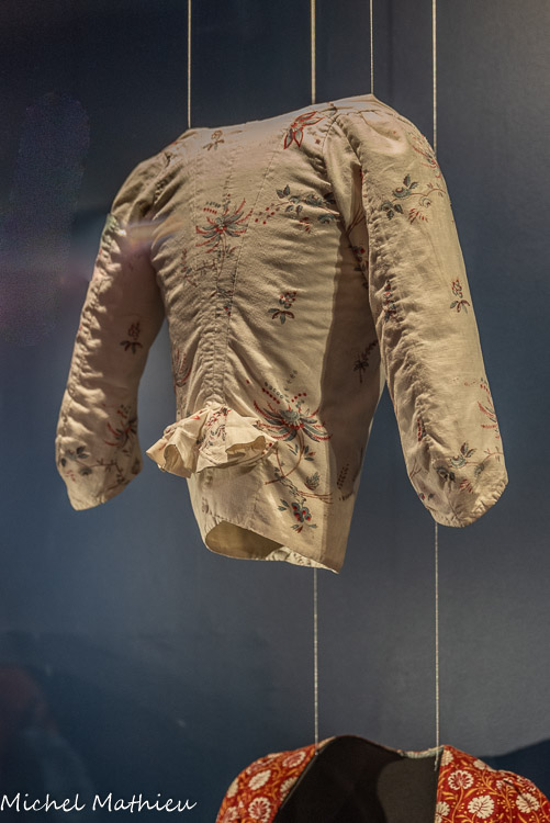 Elément constitutif de l’habit masculin à partir de 1740, le gilet est porté par toutes les classes sociales ; la différence se situe dans la qualité des matières : soie ou coton brodés, indiennes pour les plus fortunés, gros drap sombre pour les plus modestes. Les élégants peuvent en posséder plusieurs centaines dont les décors s’inspirent des tendances du moment et de l’actualité. Non visible, le dos est généralement coupé dans une étoffe de moindre qualité que le devant.