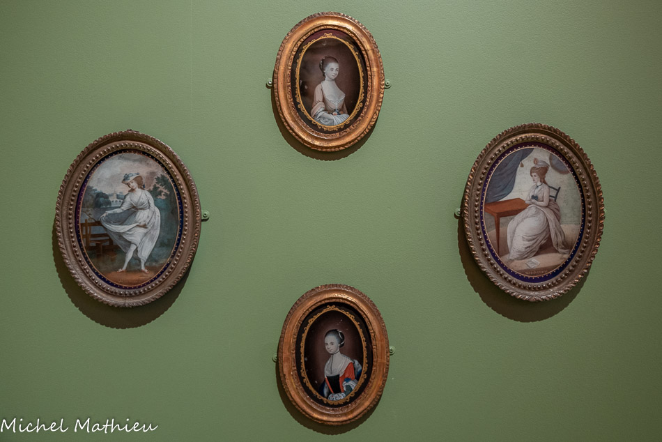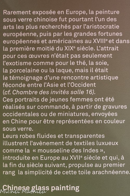 Sur ces deux tableaux, le même visage (ou celui de jumelle ?) est peint en position inversée (en miroir). Les boucles d'oreilles et la coiffure sont identiques et permettent de dater les œuvres du XVIIIe siècle, avant 1780. Las costumes sont différents, mais toujours de la même époque : la forme du décolleté, les manches et le cordon noir noué autour du cou en témoignent. Nous sommes devant des « montages » réalisés en deux parties distinctes : la tête et le buste. La tête est réalisée d'après une miniature apportée à Canton par un Occidental. Ce dernier, en commandant le ou les portraits dans l’atelier chinois, s’était vu proposer par l’artiste chinois plusieurs modèles de bustes à la mode qu’il avait peints précédemment en vue de futures commandes.