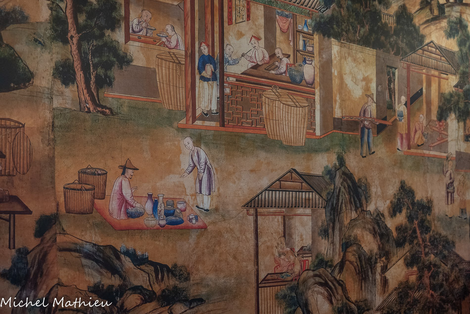 Le papier peint ici reproduit tapisse encore l’ancien salon chinois de la bastide de la Mignarde à Aix-en-Provence. Acquis par Joseph- Sauveur Mignard, ces lés de papier polychromes, importés de Chine et destinés à la clientèle européenne, ont été assemblés dans cette pièce avant la Révolution, sans doute vers 1780. Coûteux, ils étaient prisés par les élites et pouvaient être également déclinés sursoie peinte. Narratif, leur programme représente, par un pêle-mêle de scènes animées de personnages aux traits individualisés, trois secteurs d’excellence qui incarnent le dynamisme économique de l’empire de Chine : la culture du riz, le commerce de la soie et la fabrication de la porcelaine.