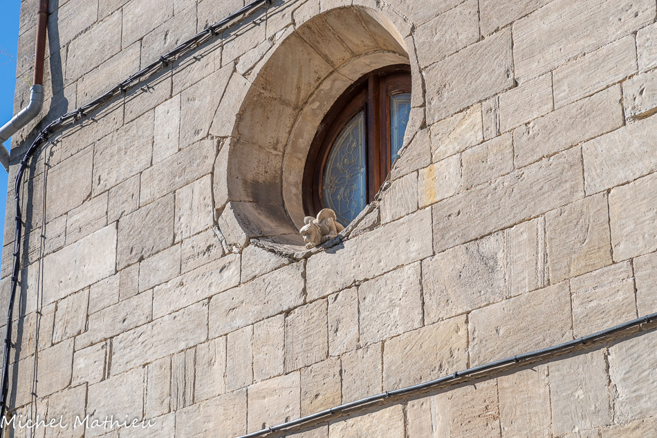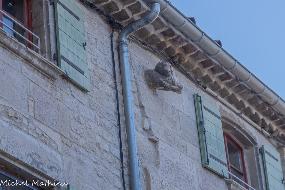 En levant les yeux, la présence de sculptures animales, sous les toitures, à droite de cette place, sont visibles : tête et partie d’un corps d'un lion...