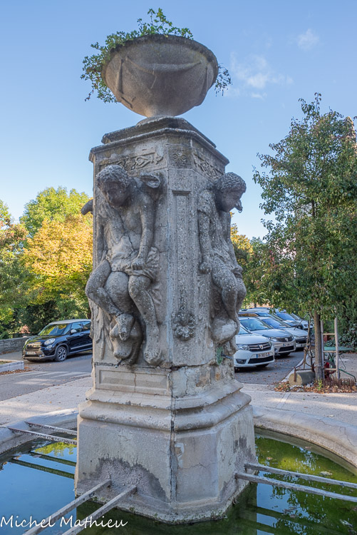 Après la destruction de deux maisons en 1839, permettant ainsi l'accès à l’ancien Hôtel de Ville, la fontaine (seule existante avant le 17e siècle) située primitivement à quelques mètres de l’entrée de la " maison de ville ", sera reconstruite, à son emplacement actuel, vers 1841. Les personnages visibles semblent correspondre à la représentation d'un homme maîtrisant un animal marin à écailles.