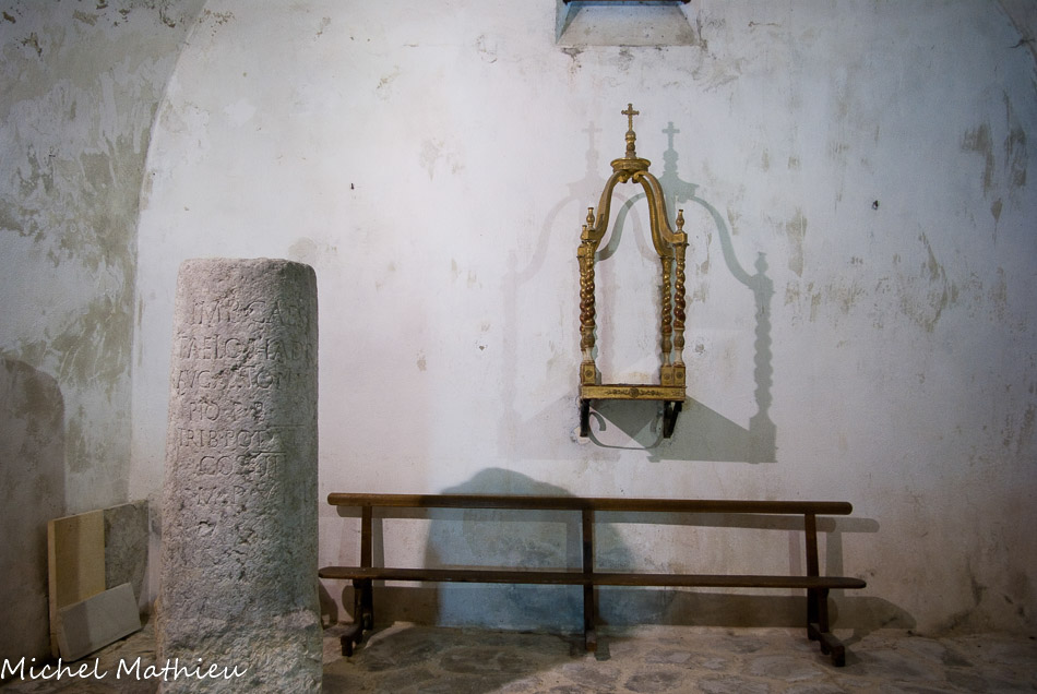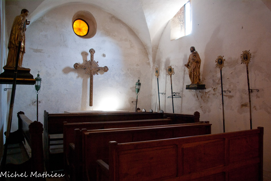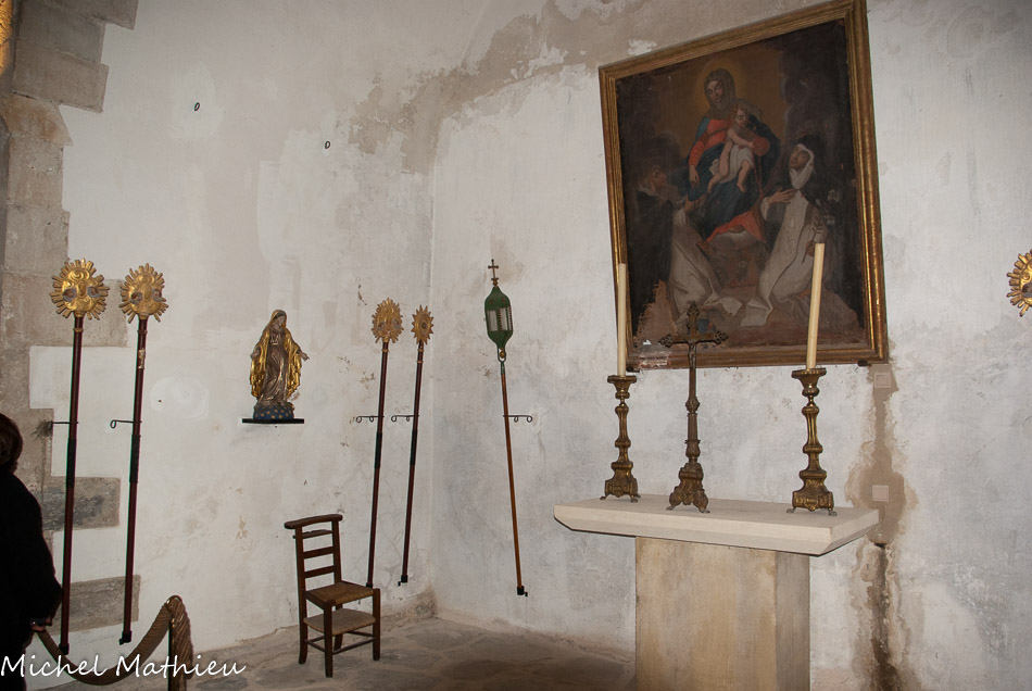 2 lanternes de procession encadrant la croix du cimetière datant du XVIe siècle. Bâtons de procession de confrérie : bâtons de pénitent. A droite, Saint Joseph, à gauche, Saint Jean François Régis, toutes les deux du XIXe, en bois taillé, peint et doré.