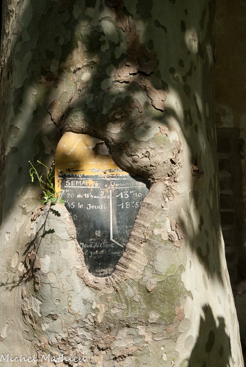 La Cité Blanche. Les horaires des bus sur ce panneau "dévoré" par un platane devant le bar Saint Joseph.
