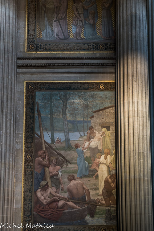 Jean-Paul Laurens, La Mort de sainte Geneviève : La scène illustre Les derniers instants de sainte Geneviève devenue vieille et vénérée du peuple. La représentation de Clotilde et de Clovis est la volonté de rappeler l’alliance temporelle entre l’Église et la royauté. Le réalisme puissant de Laurens contraste avec le style de Puvis de Chavannes. L’éclairage focalisé sur les principaux personnages donne toute la force et la vigueur et contribue à accroître l’intensité tragique de la scène.