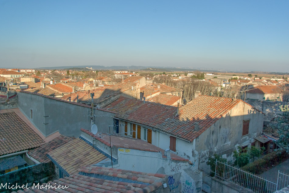 A gauche, le clocher du couvent des Cordeliers (ou franciscains) avec sa flèche gothique, qui abrite aujourd'hui le colège Saint-Charles. Au fond les arènes ou amphithéâtre.