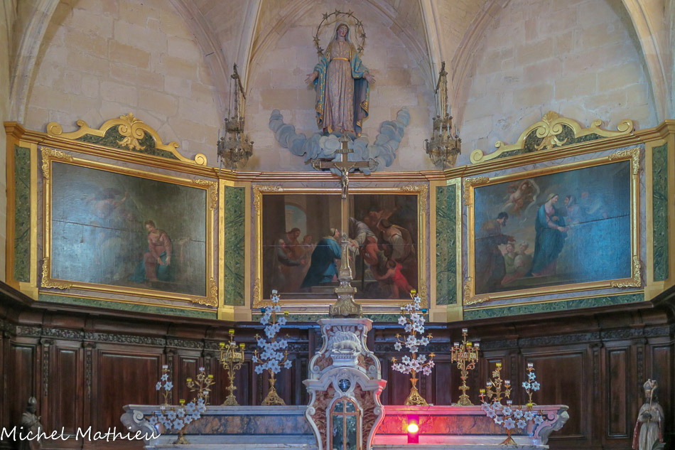 Le retable est domposé de trois tableaux du XVIIIe siècle, de l'atelier avignonnais Parrocel, représentant, de gauche à droite, l’Annonciation, la Présentation au Temple et la Visitation