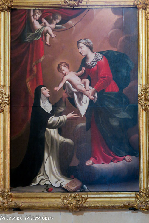 l'Instauration du Rosaire du peintre arlésien François Huard en 1837, représentant Saint-Dominique recevant le Rosaire des mains de l'enfant-Jésus porté par la Vierge et entouré des 15 médaillons des Mystères du Rosaire.