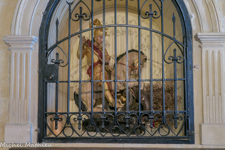 Au-dessus du banc d'œuvre de la confrérie, se trouve une niche fermée de barreaux en forme de trident camarguais. Statue en bois de saint Georges (fin du XVIe s.), patron des gardians de Camargue.