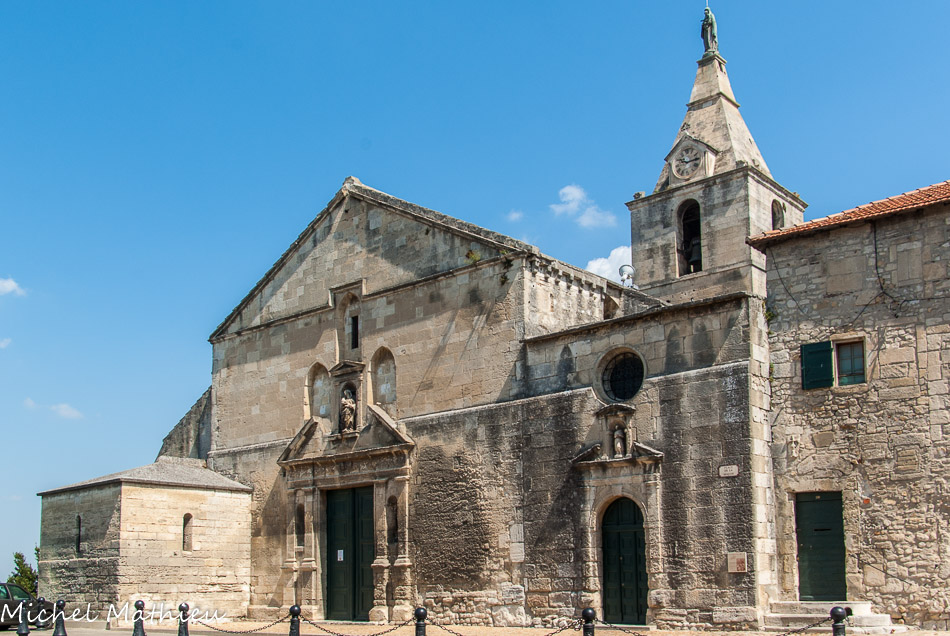 Façade principale de l'église remaniée au XVIIe siècle. Chapelle conventuelle de l’abbaye Saint-Césaire, fondée au VIe siècle par l’évêque de ce nom. Elle fut édifiée principalement en trois étapes, à partir du XIIe siècle, mais a révélé néanmoins des vestiges antérieurs. Désaffectée et démantelé à la Révolution, elle connut divers usages utilitaires, avant d’être fouillée en 1972 et 1982.
